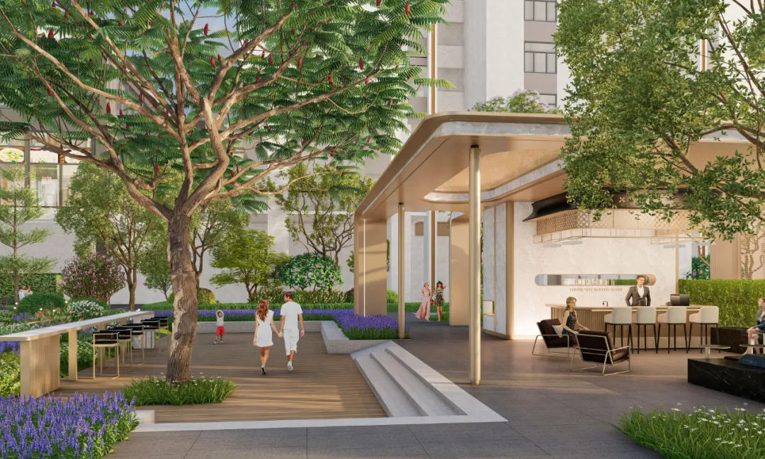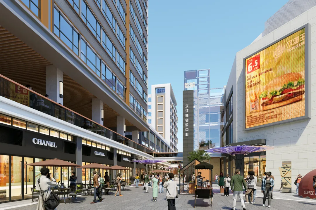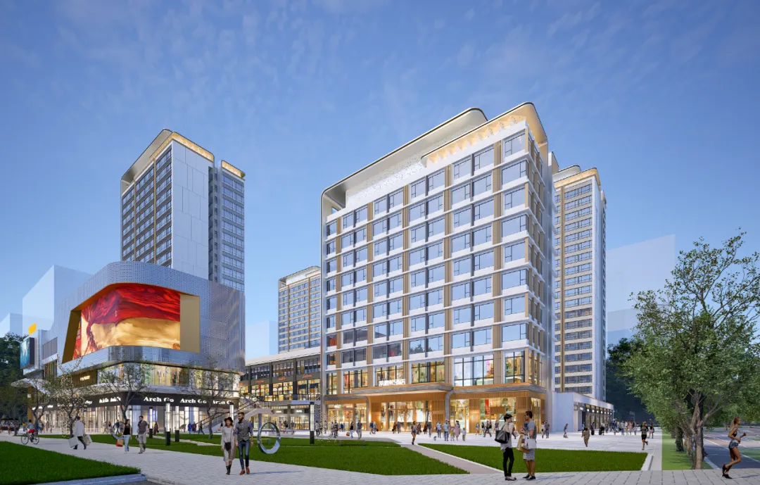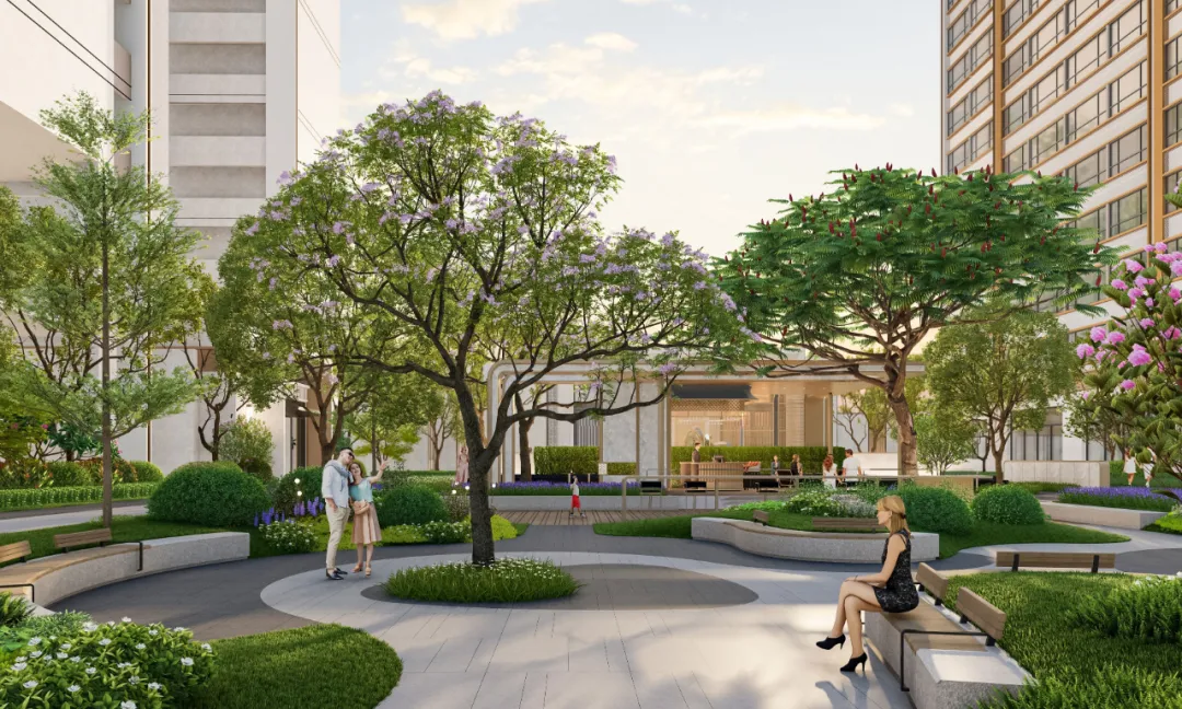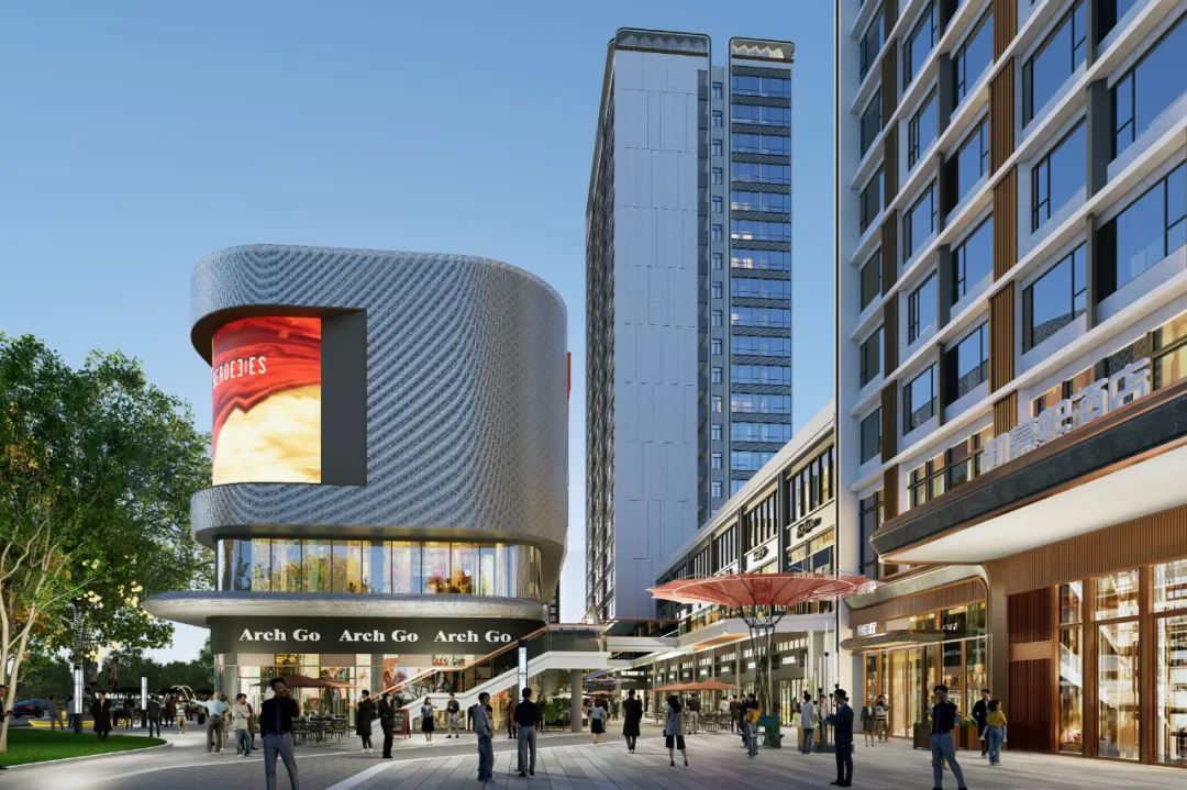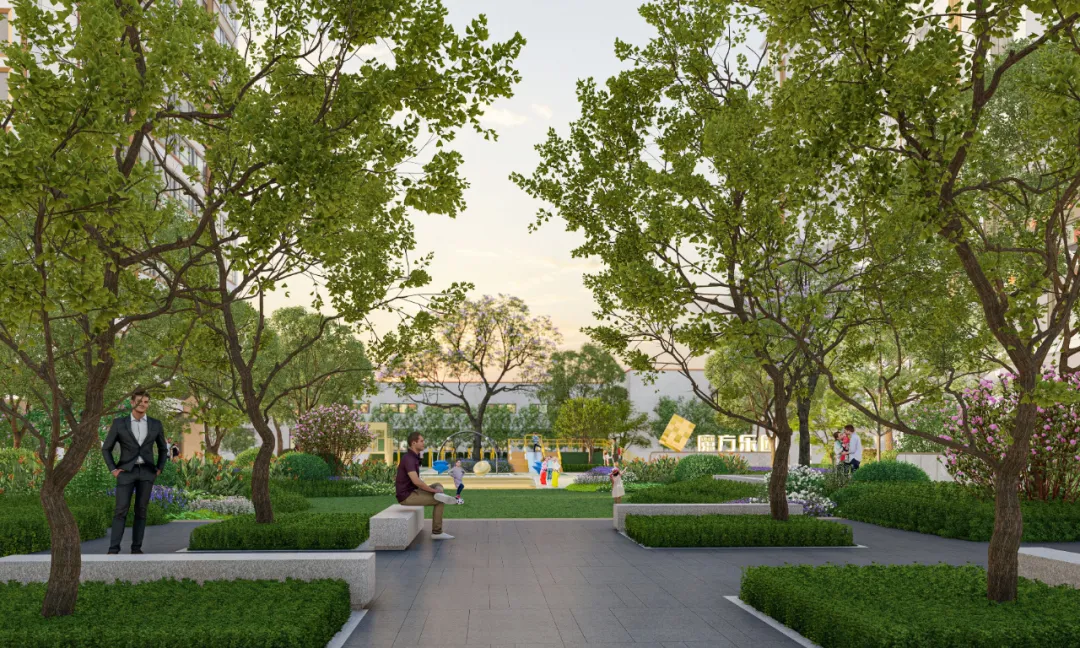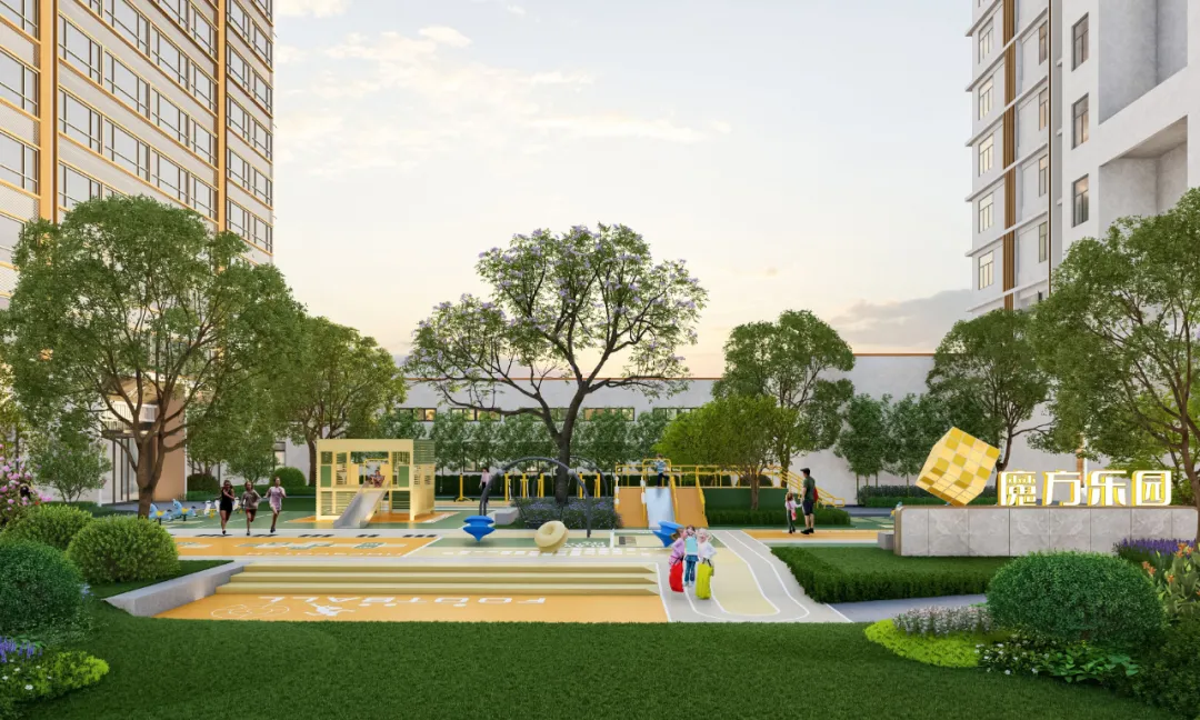 空间规划以“一径·四心·三园”为结构脉络,一条林间小径将迎宾礼园、林香野趣、魔方乐园与联动商圈串联起来,摩卡、移享、绿野三园点缀其间,形成可游可憩的森系场景。林木掩映中,休闲平台、儿童场地与商业外摆共同构成一幅生动而从容的生活画面。
