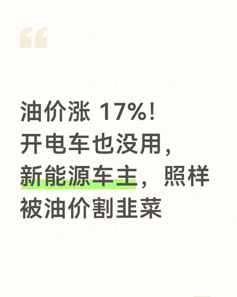 油价涨17%,开电车真的没用。现代社会没人能完全脱离石油,电车只是换了一种“被割”的方式。