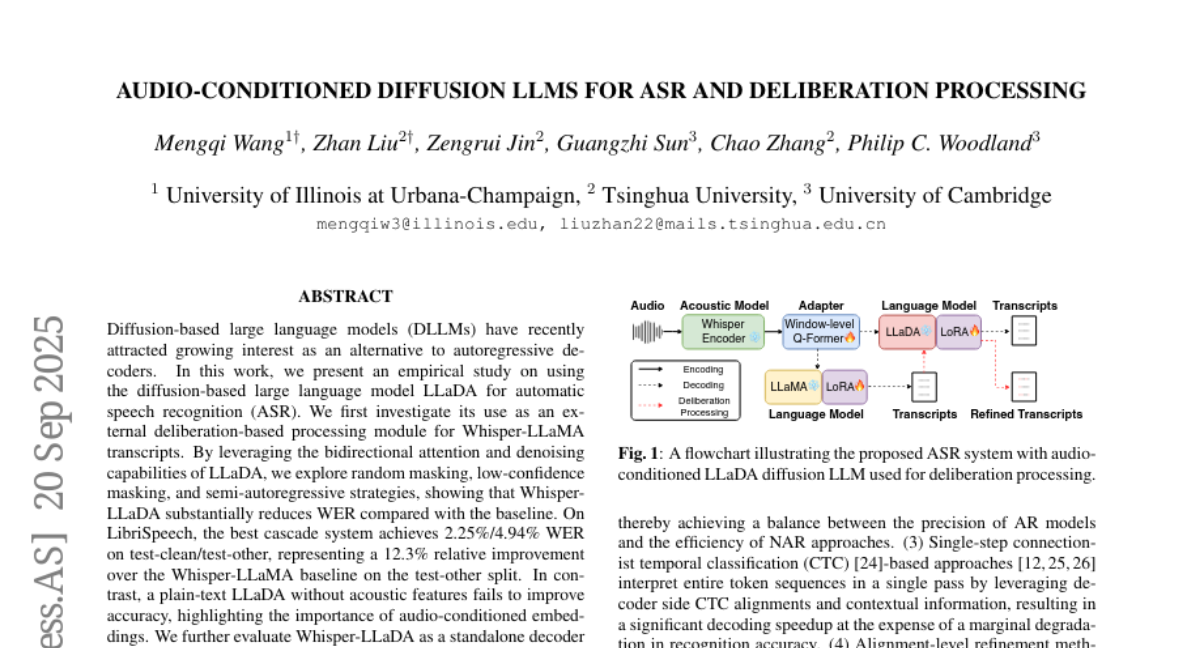 这项由剑桥大学菲利普·伍德兰德教授、清华大学张超教授以及伊利诺伊大学香槟分校等顶尖学府合作完成的研究,发表于2025年9月的ArXiv平台(论文编号:arXiv:2509.16622v1),首次将扩散大语言模型技术引入语音识别领域。想了解完整技术细节的读者可以通过该编号查询原始论文。