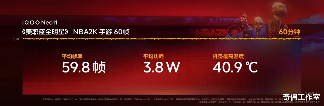 iQOO与《美职篮全明星》深度联合优化游戏体验,1小时平均帧率高达59.8帧,平均功耗低至3.8W,机身最高温度仅40.9度。