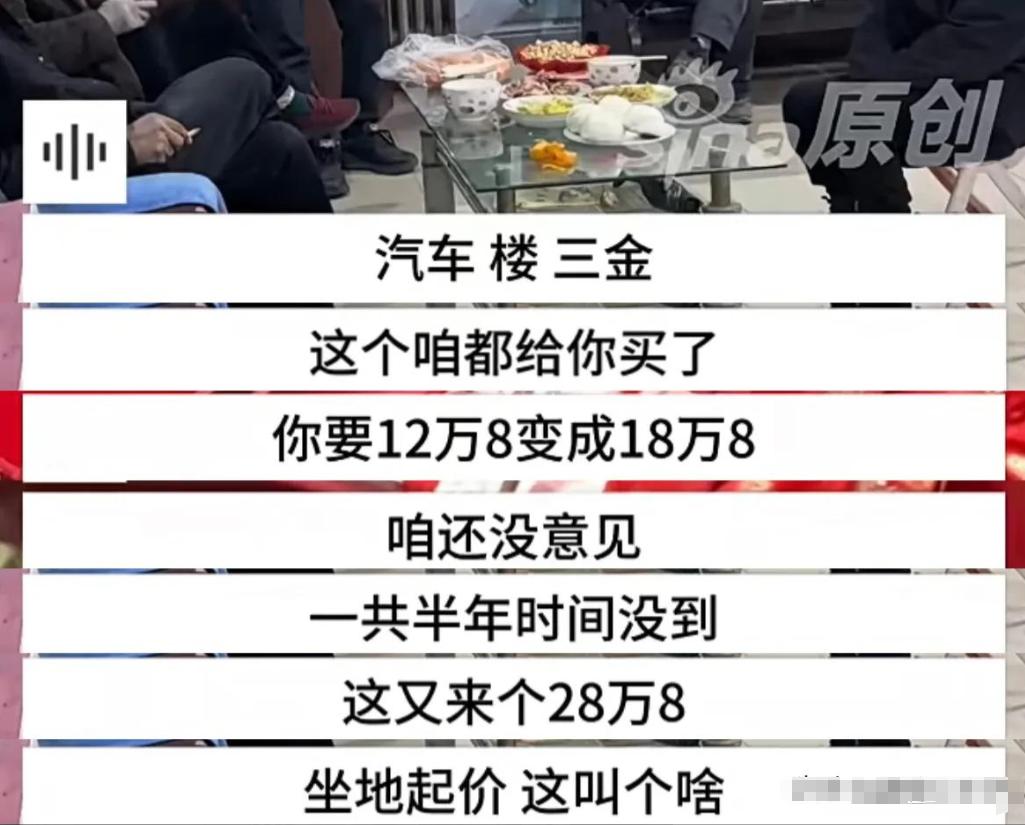 视频中,一位老人说道:“你要汽车、楼房,三金都已经给买了,彩礼也从12万8涨到18万8,我都没意见。可这半年不到,又抬高到28万8,眼看着结婚日子快到了,竟然坐地起价,这样做太不讲理了!临到头了想着再捞一笔,实在太物质了吧!”