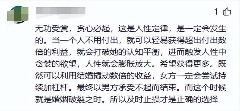 还有网友说:无功受赏,贪心必起,这是人性定律,是一定会发生的。当一个人不用付出,就可以轻易获得超出付出数倍的利益,就会打破她的认知平衡,进而触发人性中贪婪的欲望,人性就会膨胀放大。希望获得更多。既然可以利用结婚撬动数倍的收益,女方一定会尝试持续加杠杆。最终以男方承受不起而结束。而这个时候就是婚姻破裂之时。所以及时止损才是正确的选择