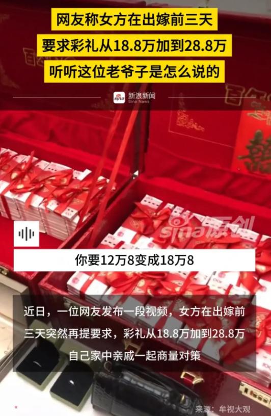 女方家和男方家商量好的彩礼是18.8万,可没想到,女方在出嫁前三天突然提价,从18.8万涨到了28.8万。这位老爷子说:“这钱我可以拿,但得看人品,光想着捞一把,我也不怕别人笑话。到时候丢人就丢,没办法,退回去就是了。”