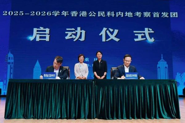 10月14日上午,考察團走進重慶育才中學(謝家灣校區),並在校內出席首發團的啟動儀式。儀式上,香港特區政府教育局局長蔡若蓮博士與重慶市教育委員會代表簽署渝港教育合作備忘錄,香港金文泰中學與重慶市育才中學締結姊妹學校,進一步推進渝港教育交流合作。
