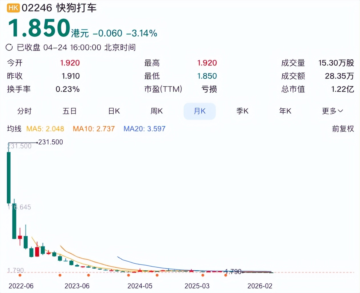 快狗打车虽然是“同城货运第一股”,但长期深陷亏损泥潭,2018年-2025年累计亏损54.45亿元。如今,快狗打车的股价仅为2港元/股左右,相较上市初231.5港元/股的高点,缩水超99%。