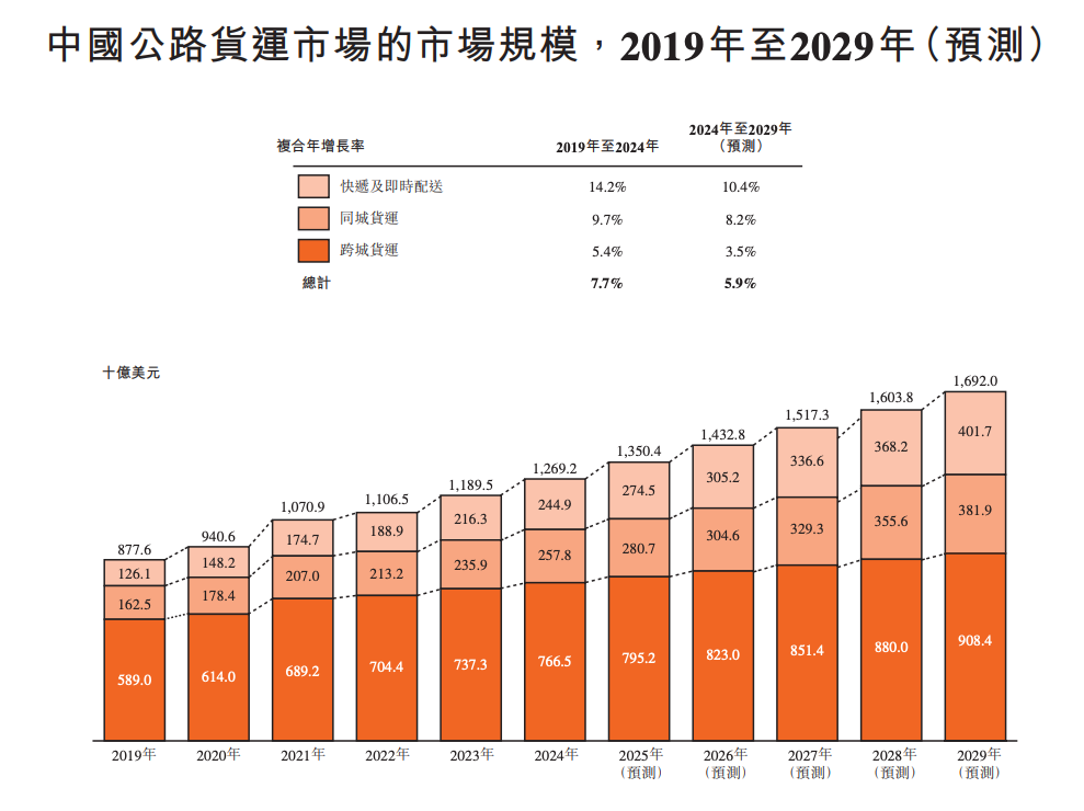 从市场维度来看,58同城分拆的诸多业务都拥有广阔的发展空间。以快狗打车为例,其聚焦同城货运市场。弗若斯特沙利披露的数据显示,2024年,中国公路货运市场规模达1.27万亿美元,预计2024年-2029年的复合年增长率为5.9%。