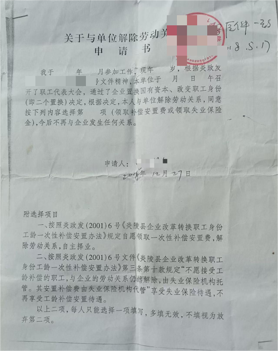 职工还提到,部分《解除劳动关系申请书》仅预留签名栏,未填写参加工作时间、职代会时间、补偿方式等关键信息,57 名职工中多人表示 “未签署过该申请书”,8 名曾参与诉求反映的职工里,有 4 人称 “从未见过相关合同”。此外,2004 年改制期间存在 “单位先审批、再让个人签字” 的情况,部分《终止 (解除) 劳动关系证明书》的签名日期早于盖章日期,职工认为相关流程需进一步核查。