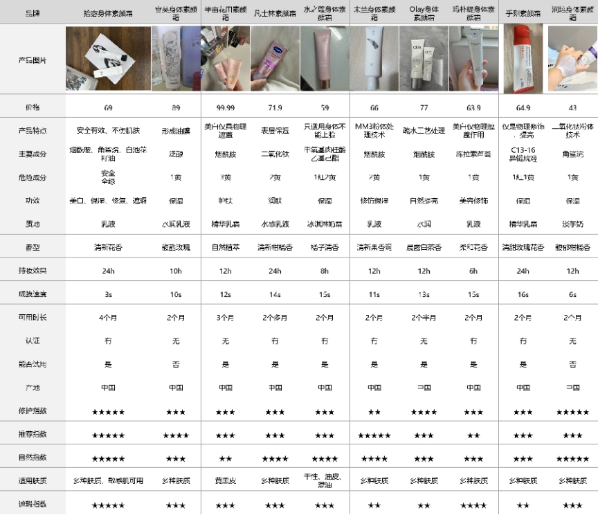 为了让大家快速看清这10款身体素颜霜的核心差异,我整理了一份实测参数对比表,所有数据都是这14天我自己实测出来的,不掺假、不虚标,重点看妆感、成分安全性、用量耐用性、质地延展性这些关键指标,帮大家快速初步筛选,可重点关注参数里的自然指数和适用肤质。