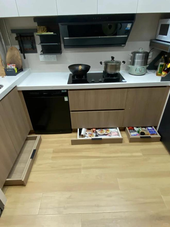 后来随着极简风格装修的流行,有些人为了追求所谓的好看,就学着衣柜的设计,把柜门拉长靠近地面,让这个加上的柜门把踢脚板遮挡起来。