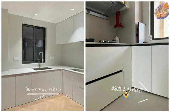 另外,就是在厨房里炒菜时,想打开柜门拿盘子,因为是落地的款式设计,还打不开,稍有不注意就会刮伤脚。