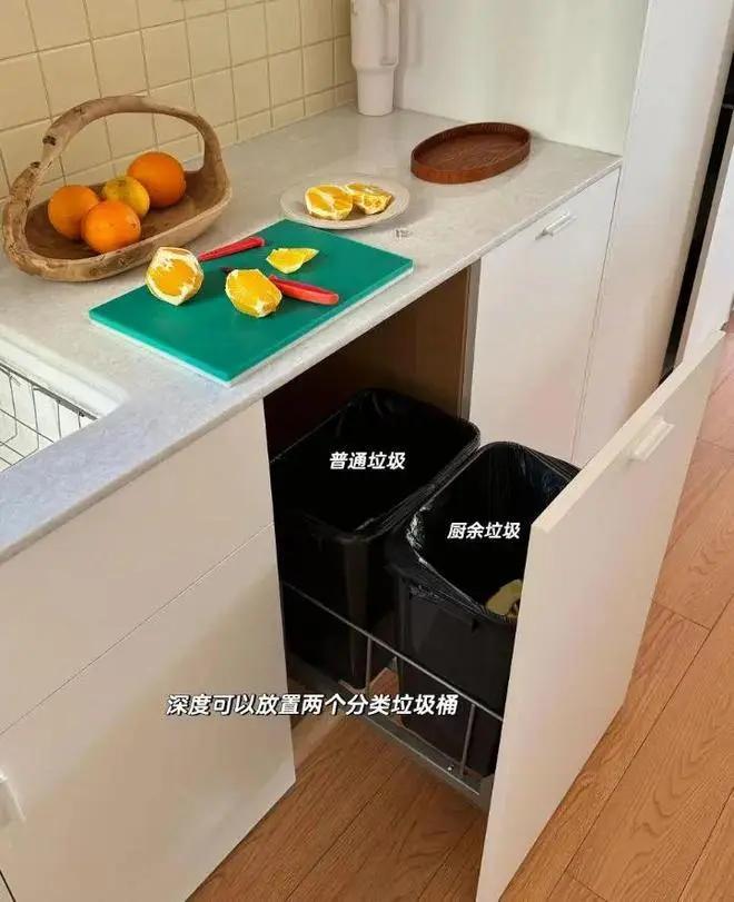 对于没有居家生活经验的人来说,在装修时颜值是首要的,在内心里是极力反感将垃圾桶摆在厨房地面上的。