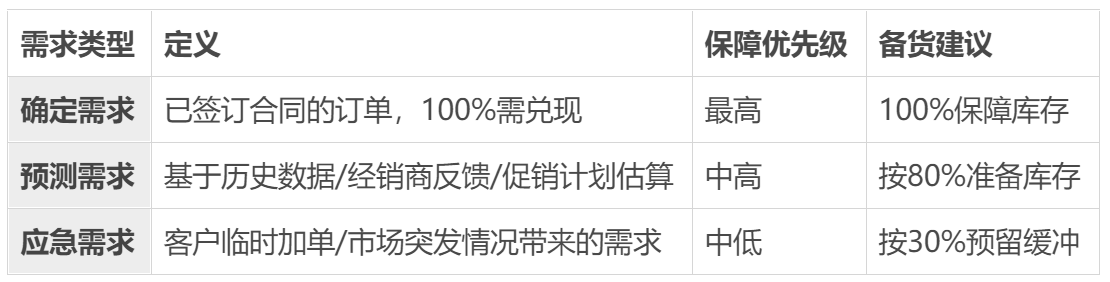 确定需求是必须满足的,预测需求得重点保障,应急需求要尽力协调,后面的供应端才能针对性配合,你懂我意思吗?