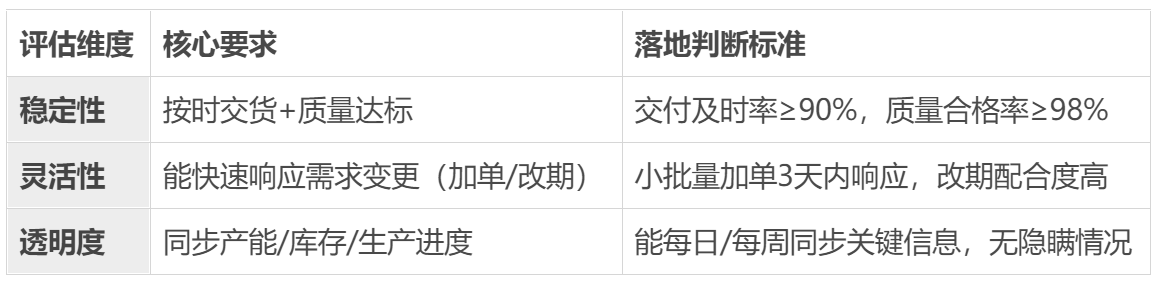 跟核心供应商建立长期合作关系,同步你的需求计划和产能情况,让供应商为你预留产能;建立供应商评价机制,从交付及时率、质量、灵活性等方面打分,淘汰不靠谱的供应商。