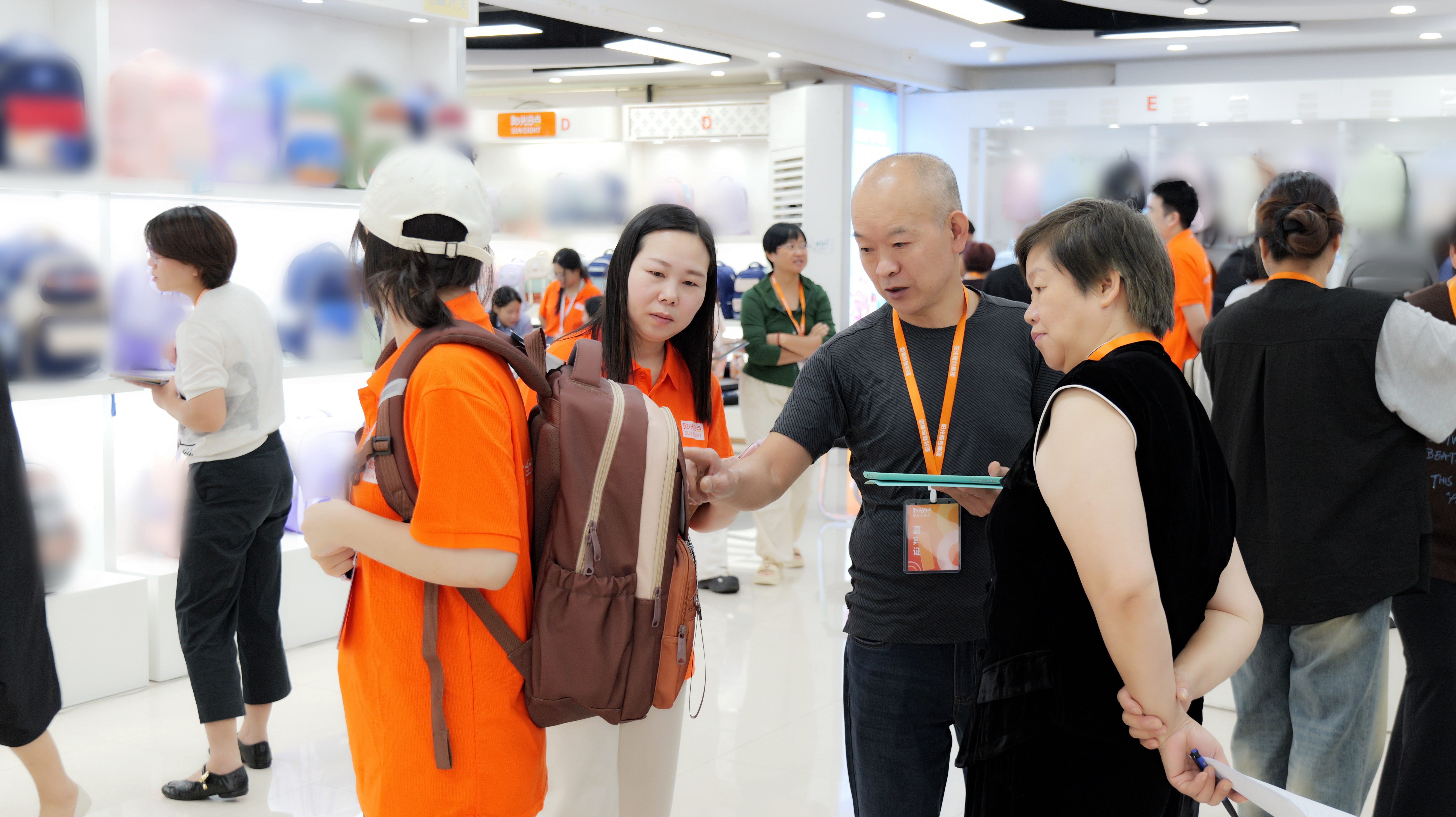 宾尼斯、澳普森、佐丹宾森、SE 三大品牌的综合展厅内,氛围同样热烈。此起彼伏的问询声混着偶尔响起的计算器按键声 ,经销商们或翻看包袋的内部隔层,或测试拉链、五金配件的耐用度,不少人将书包直接背上身,亲自感受背感。