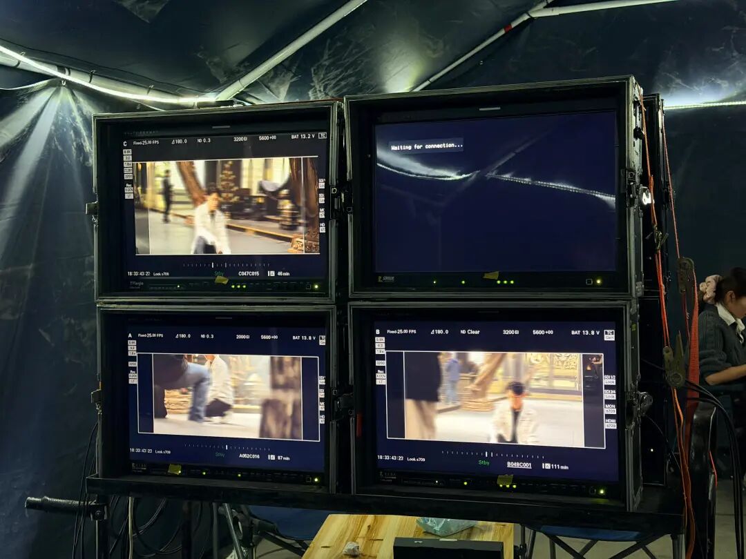 导演金雄豪面前的高清监看大屏被划分为四个画面,实时呈现着不同机位的拍摄现场。演员的微表情、光影的细微变化,甚至服装上的刺绣与褶皱都清晰无误,所有问题都能即时调整。
