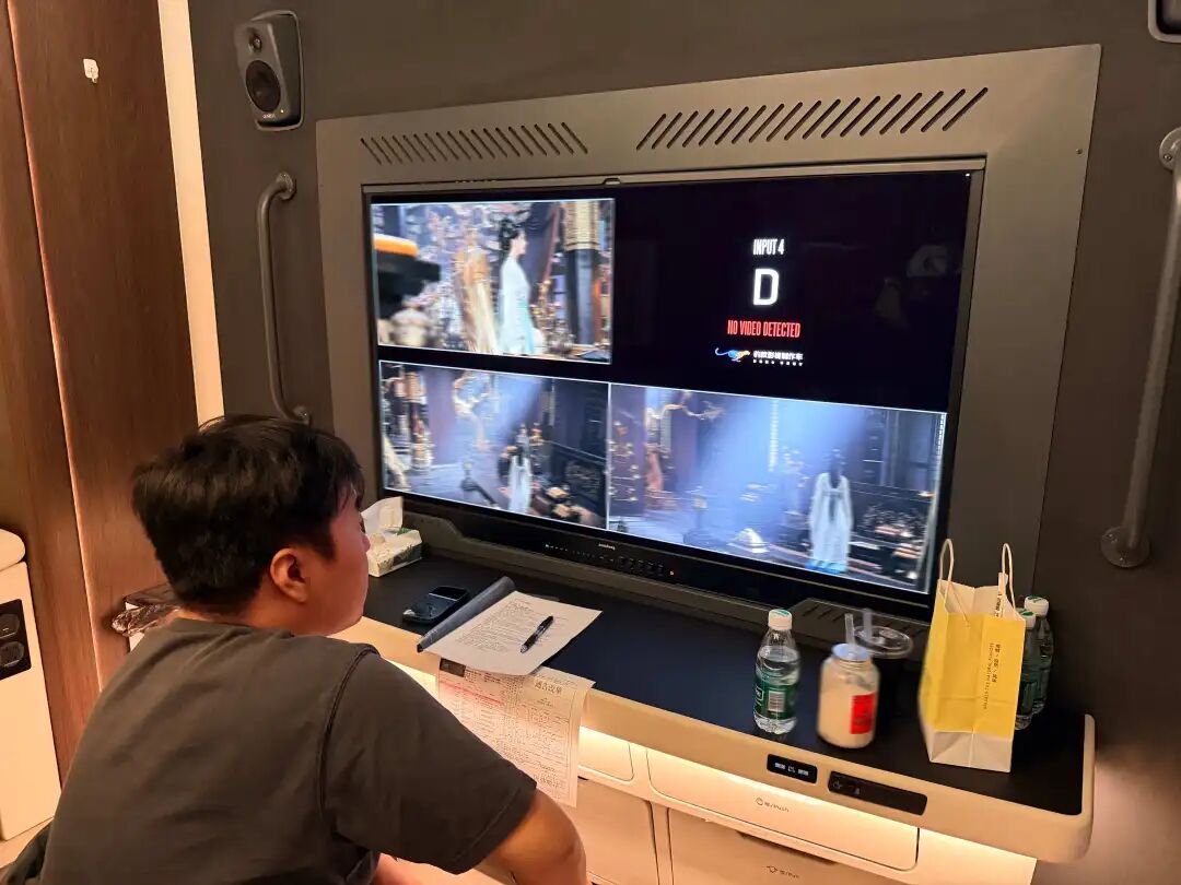 另一侧,摄影指导与灯光指导紧挨着坐,通过大屏监看画面,实时沟通、调整现场的灯光参数。