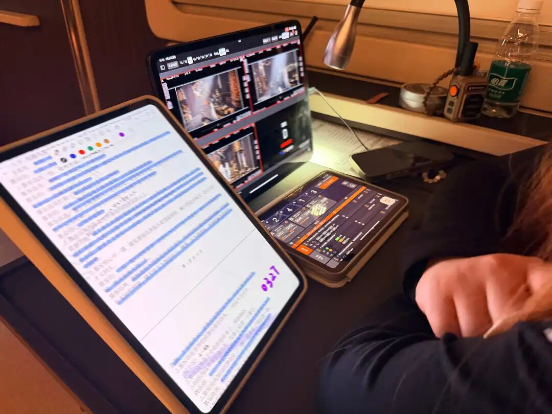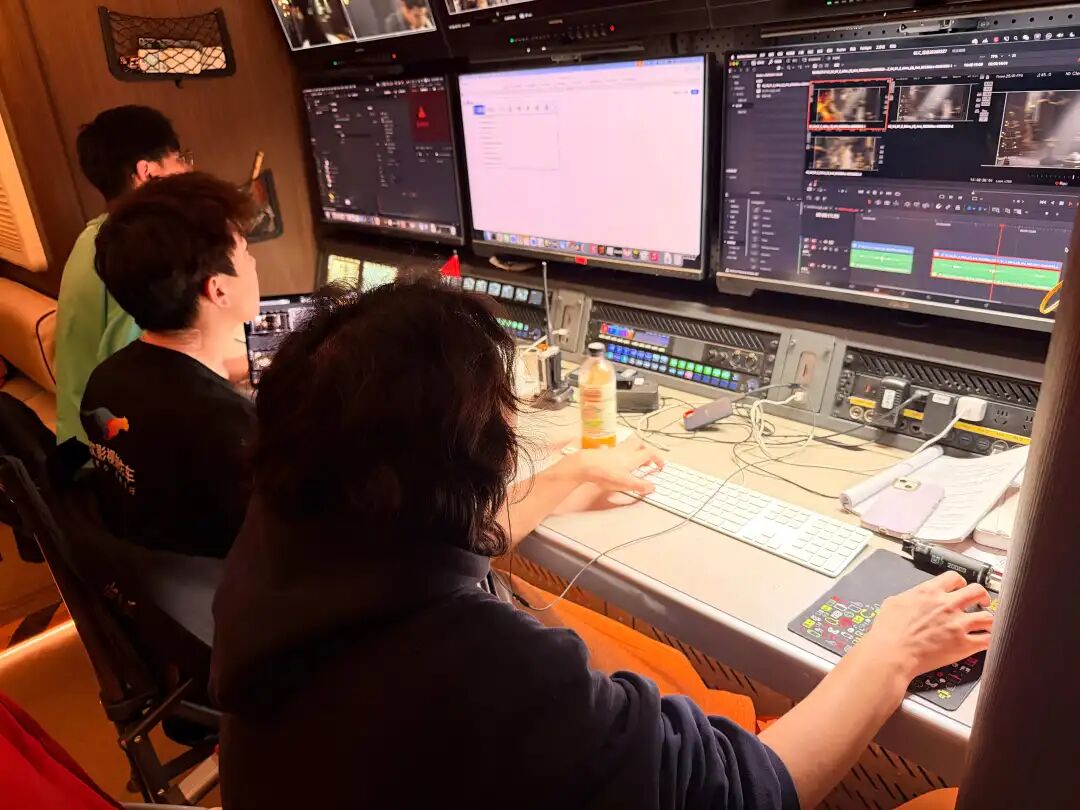 在他们身后,视效师实时记录想法,调色师在预处理素材,剪辑师则将导演刚刚确认可用的镜头进行粗剪,甚至能做到现场配乐。