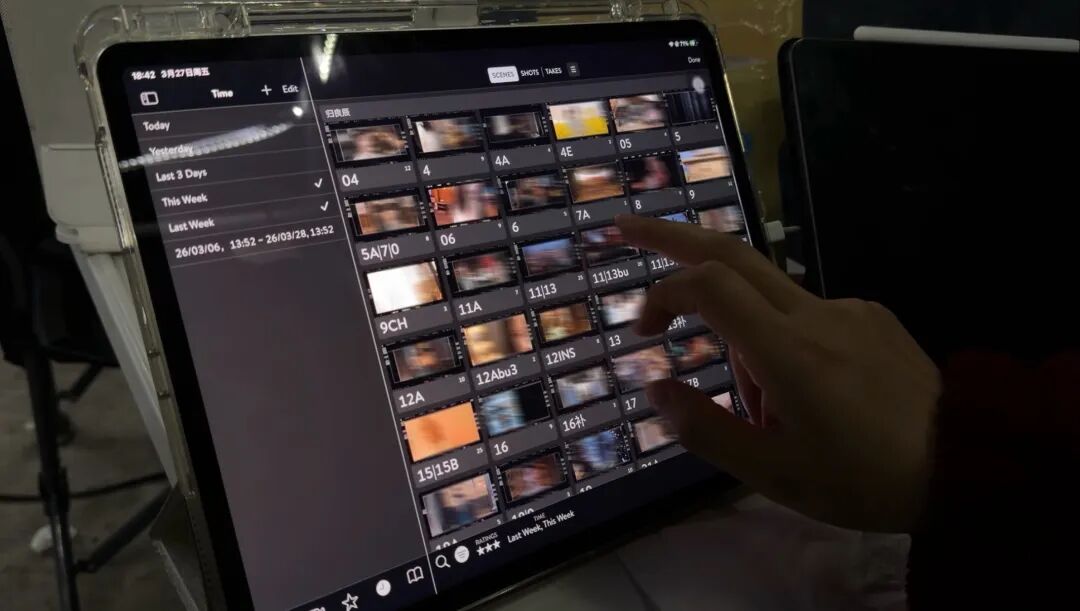 他的侧边,场记使用影视车配套的Qtake系统在平板电脑上飞速记录场次、镜头,取代了传统的纸质场记单;
