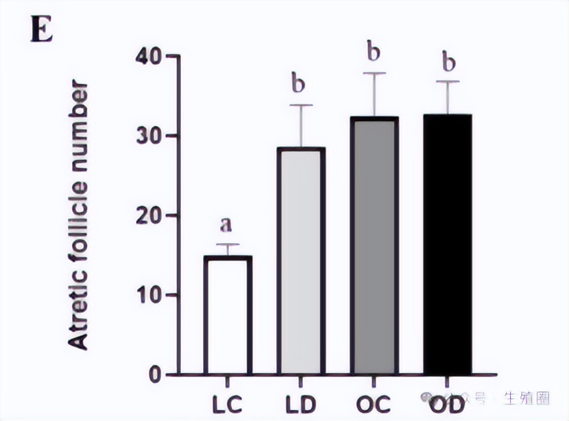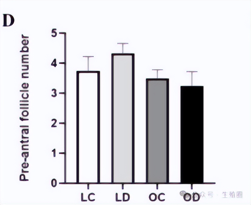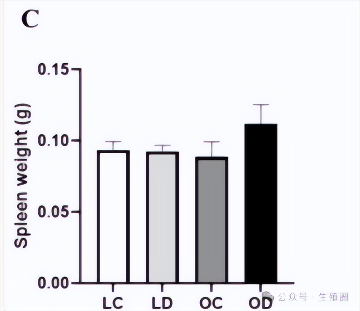 我们再来看卵巢的变化,最严重的损伤出现在肥胖且打了DMBA组的母鼠(OD组),它们的卵巢重量比最健康的对照组(LC组)显著减轻了大约25%。