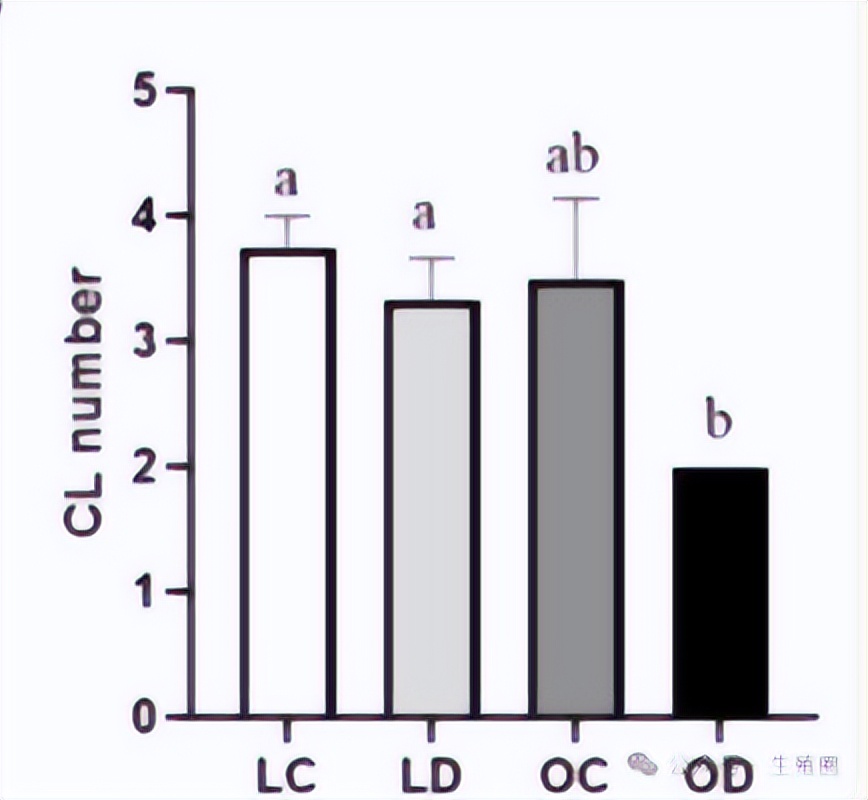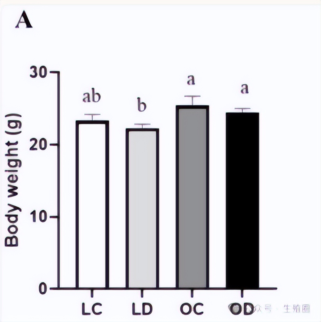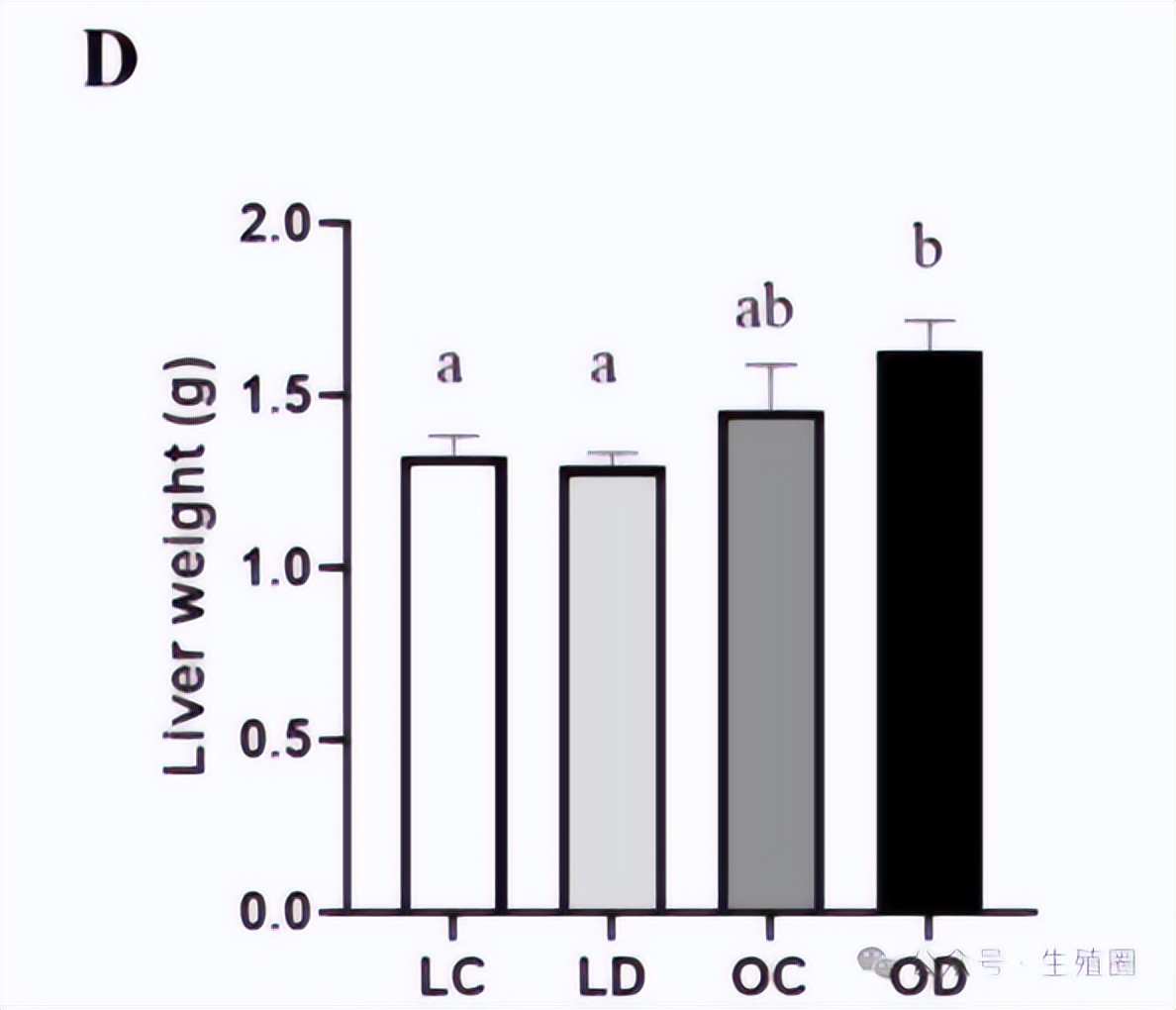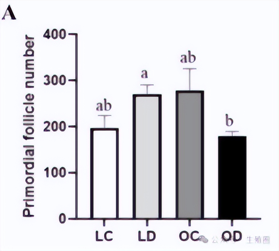 我们再来看卵巢的变化,最严重的损伤出现在肥胖且打了DMBA组的母鼠(OD组),它们的卵巢重量比最健康的对照组(LC组)显著减轻了大约25%。