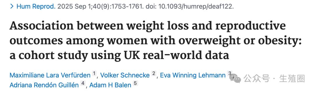 Association between weight loss and reproductive outcomes among women with overweight or obesity: a cohort study using UK real-world data. Hum Reprod. 2025 Sep 1;40(9):1753-1761. doi: 10.1093/humrep/deaf122.