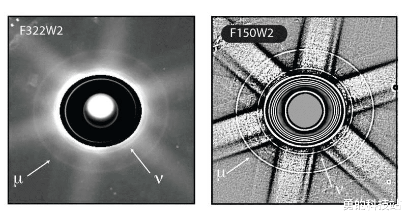 天王星外环系统在宽带滤波器中以3.2毫米(左)和1.5毫米(右)为中心拍摄的天王星外环系统。m环和n环均用箭头表示。左图:图F322W2:为了可视化整个系统,天王星及其主环系统强度减弱了100倍。右图:图像F150W2:为了看到天王星散射光和主环上方的m环和n环,这幅图像经过了高通滤波器。图片来源:NASA,欧洲航天局,图像处理:Imke de Pater,Matt Hedman