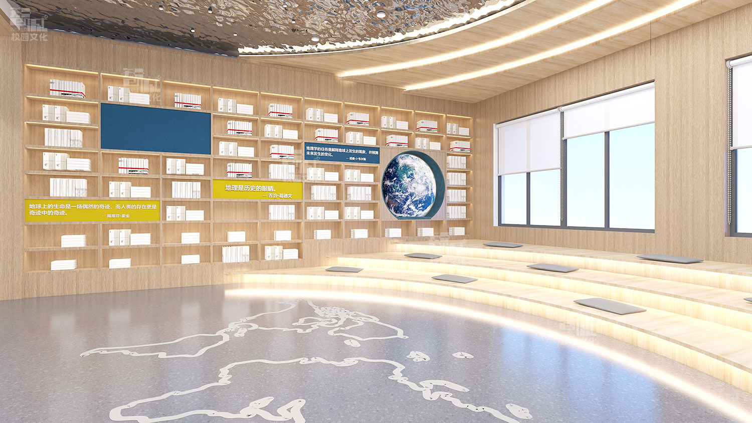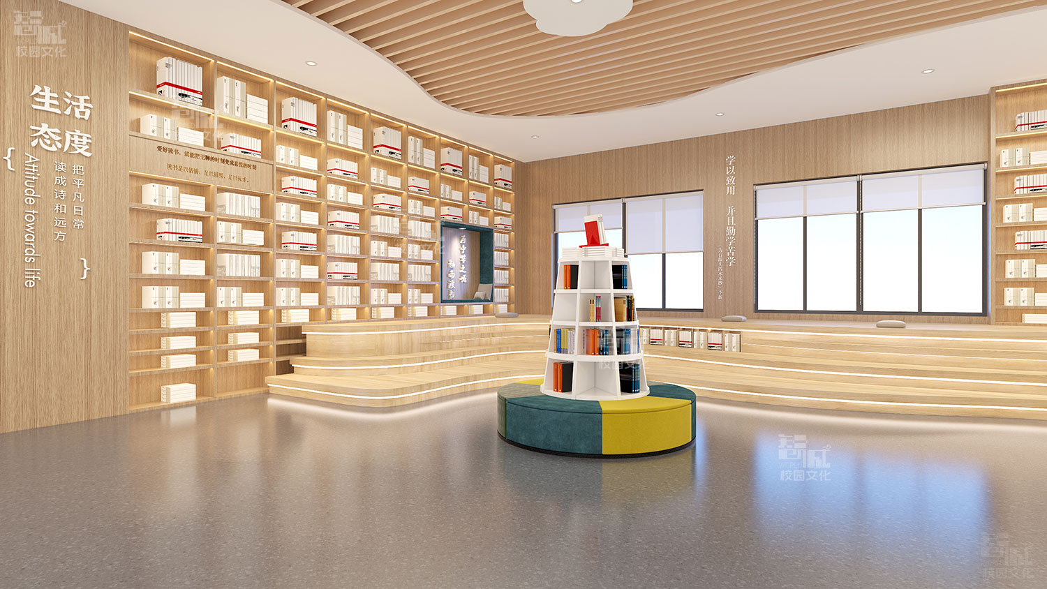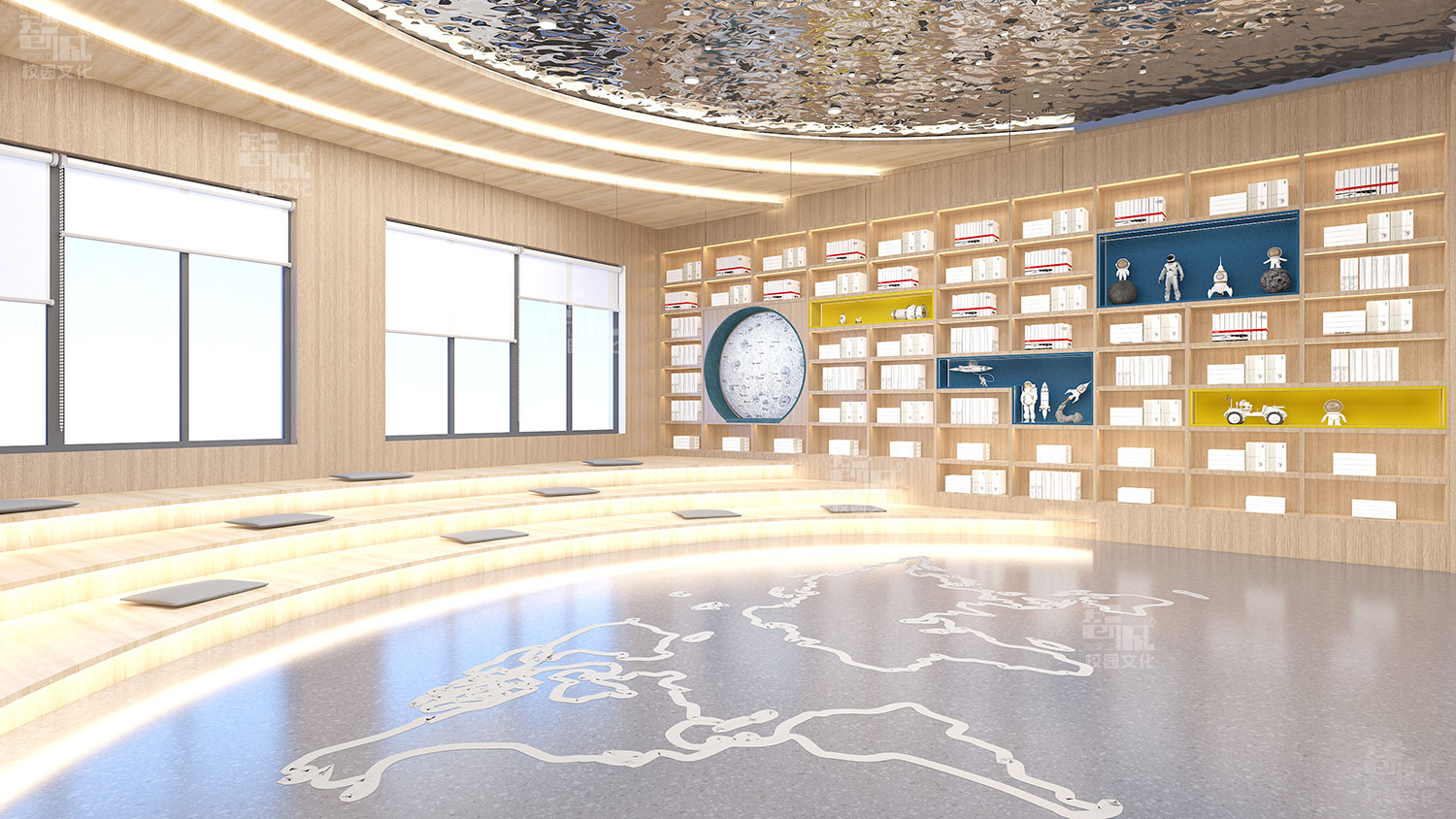在其“电子阅读区”,我们没有将设备零散地摆放,而是以发光柱为核心,形成具有向心力的环形布局。这不仅是功能的集合,更是一种行为与心理的暗示:这里是一个专注于数字探索的区域。同时,我们将VR阅读和朗读亭巧妙地分布其间,为个性化的探索与表达提供了恰到好处的私密角落,科技在此服务于自主性与沉浸感。