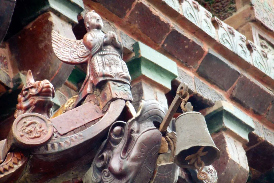 这些砖,就像经过斧凿的木料一样,有榫、眼,严密组装合缝。塔身的檐、椽、瓦等都为琉璃砖构成。
