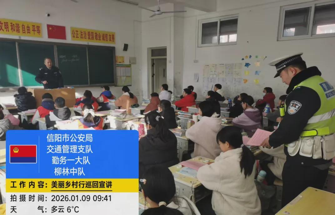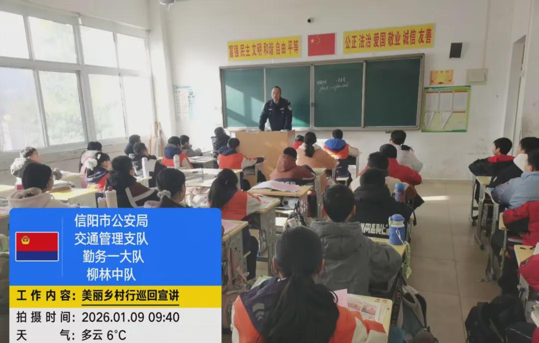 为进一步提升农村地区学生的交通安全意识和自我保护能力,筑牢校园交通安全防线,1月9日上午,信阳市公安局交通管理支队勤务一大队组织民辅警走进浉河区柳林乡第二中心小学开展“美丽乡村行”交通安全巡回宣讲活动。