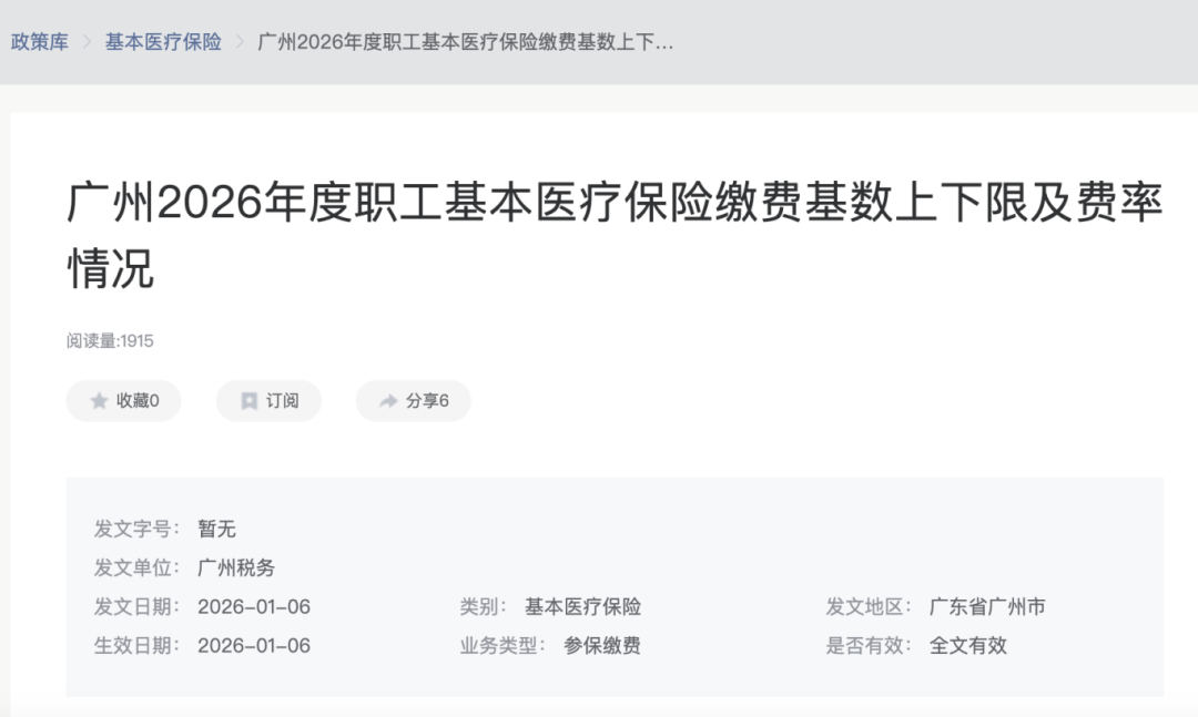 2026年1月6日,广州税务发布《2026年度职工基本医疗保险缴费基数上下限及费率情况》。