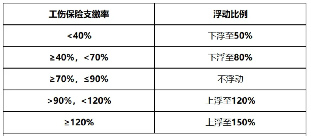 根据工伤保险费率浮动办法,在基准费率的基础上,以用人单位上一年度工伤保险支缴率为主要考核指标,综合考虑工伤发生率情况,在其所属行业不同费率档次内,调整和确定用人单位缴费费率。其中一类行业费率只上浮不下浮,二类至八类行业费率可上下浮动,上浮最高不超过本行业基准费率的150%,下浮最低不低于本行业基准费率的50%。具体浮动标准为: