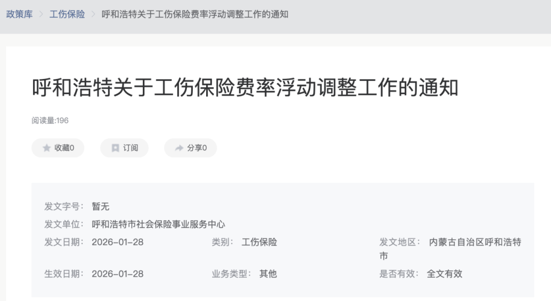 一、自2026年1月1日起,我省一类至八类风险类别的工伤保险行业基准费率从0.3%、0.6%、0.9%、1.1%、1.4%、1.7%、2.0%、2.3%分别调整为0.2%、0.4%、0.7%、0.9%、1.1%、1.3%、1.6%、1.9%。