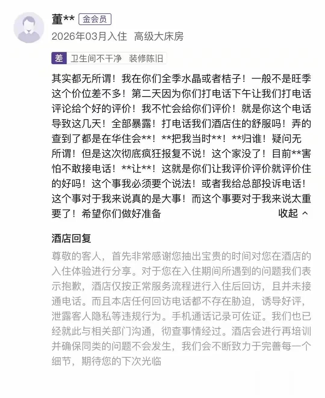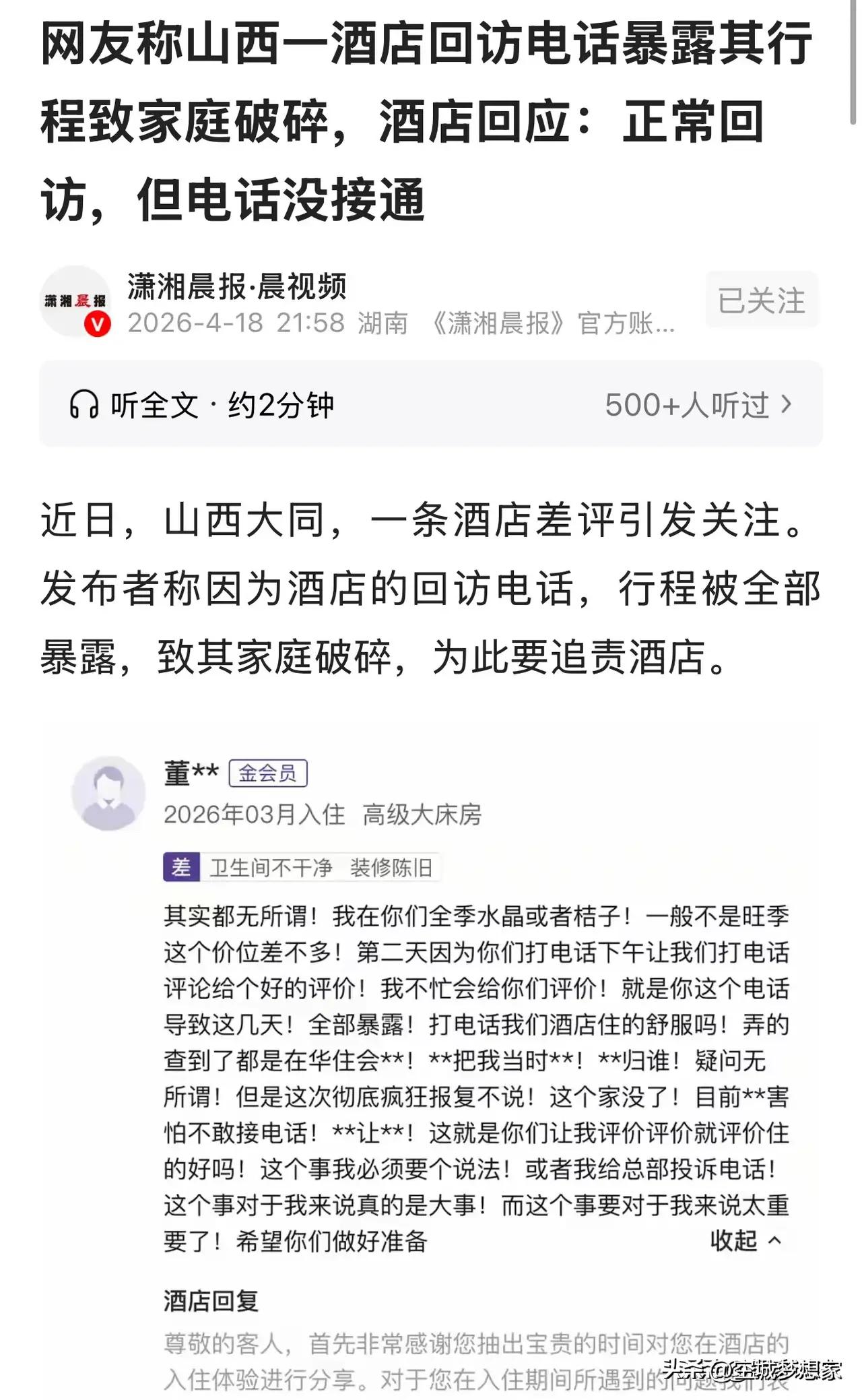 这件事也撕开了酒店行业的一个痛点:为了好评率,没完没了的回访、诱导好评,不仅打扰客人休息,更在无形中放大了隐私泄露的风险。如果不是这种无孔不入的回访,这场闹剧或许也不会以这样的方式收场。