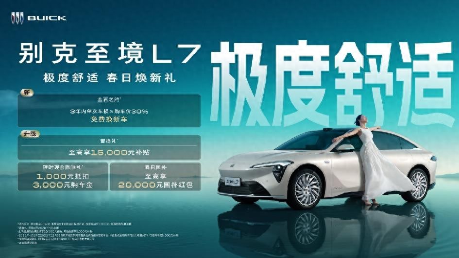 在实现用户体验进阶的同时,别克至境 L7 同步发布 “春日焕新” 权益。推出新能源轿车领域首个重大车损 “只换不修” 的 “金石之约” 保障:符合条件的非营运车主,3 年内单次事故车损超过购车开票价 30%,即可免费置换全新车辆。同步上线的 “春日焕新礼” 诚意十足:即日起至 2026 年 4 月 30 日,购车可享至高 15,000 元置换补贴,可叠加 1,000 元抵 3,000 元限时现金膨胀礼(详情请咨询别克授权经销商)。此外,用户还可享至高 20,000 元 “春日国补红包”。从购车到用车,从日常守护到意外保障,别克以贯穿用户全生命周期的确定性体验,让每一份信赖都有坚实保障。