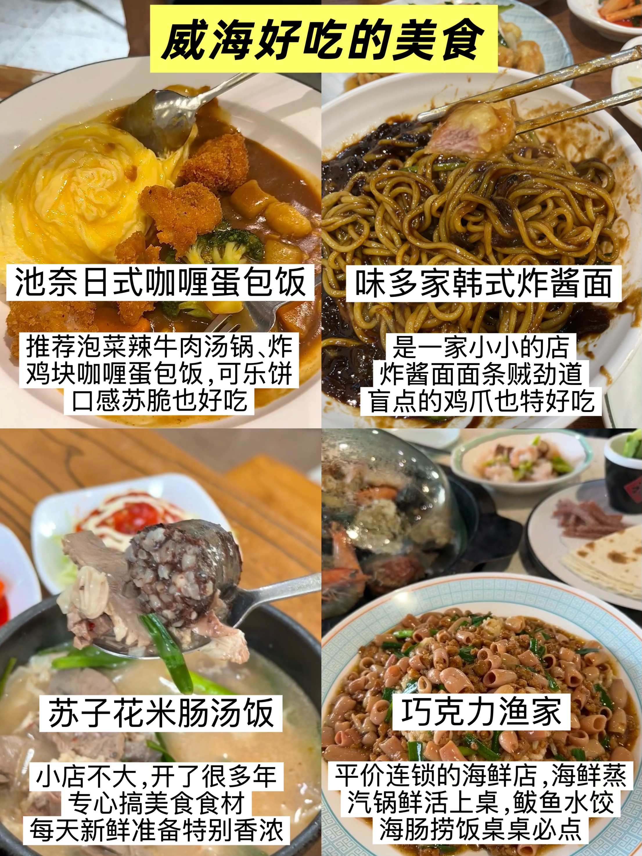 -威海韩餐和海鲜很出名,韩餐味多家韩式炸酱面面条贼劲菜品盲点都好吃;巧克力渔家是平价连锁的海鲜店,主打新鲜,鲅鱼水饺海肠捞饭桌桌必点