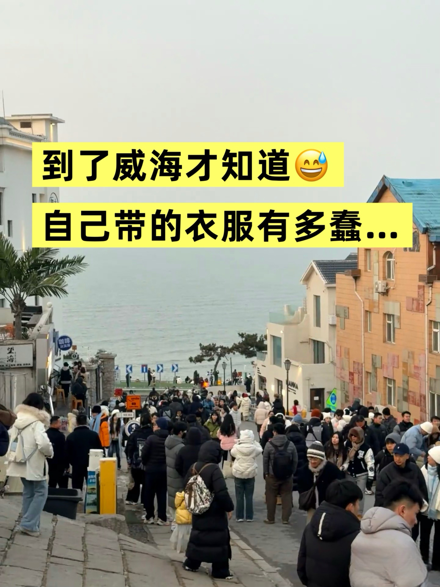威海最近再回温了,天气好的时候温度高达十几度,游玩感觉很ok,特别厚实的衣服可以不用带啦,衣服穿羽绒服➕内搭就可以,天气好的时候可以穿大衣拍拍照📷