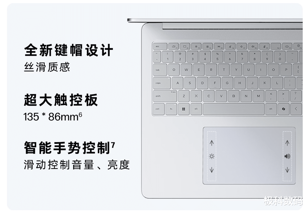 这款笔记本采用了“全新模具”。全新的键帽设计和增大的触控板(135*86mm)也是两个非常加分的细节。大尺寸触控板配合智能手势控制,在不需要鼠标的场景下,无论是切屏还是缩放,都会顺手很多。对于经常出差的人来说,直接就可以免去了鼠标“累赘”。
