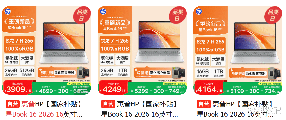 首先,我们先看价格,惠普星Book 16 2026锐龙版 有三个版本: