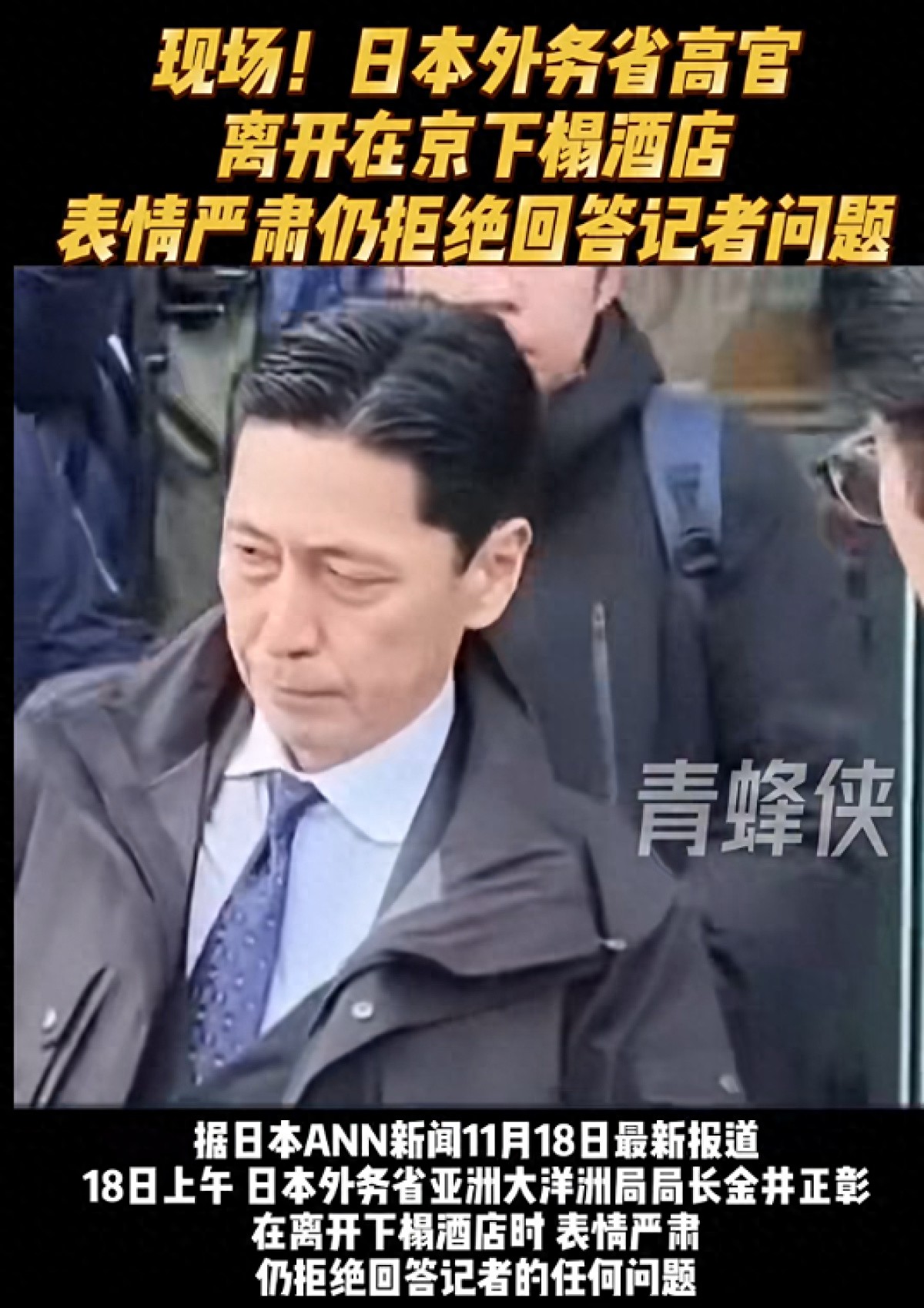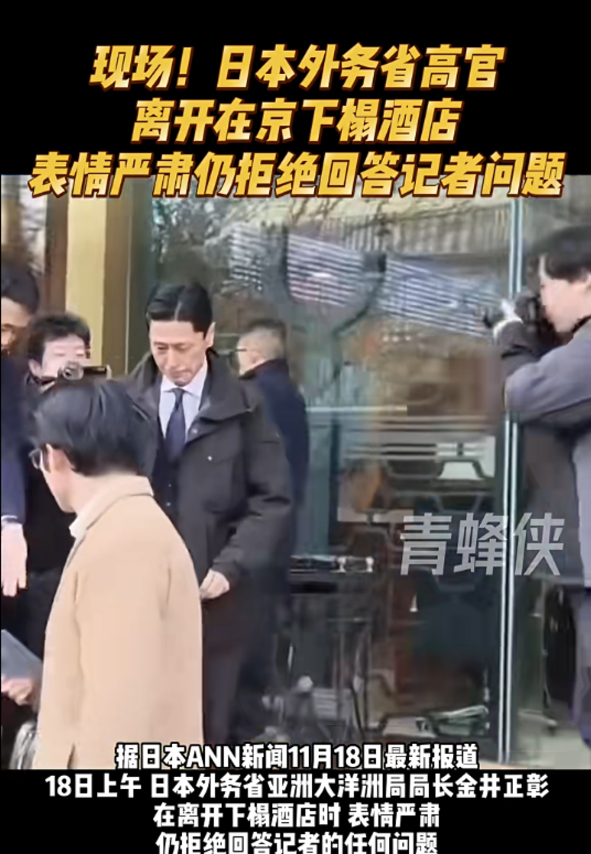 据青蜂侠援引日本ANN新闻,11月18日上午,日本外务省亚洲大洋洲局局长金井正彰离开在京下榻酒店时,表情严肃,仍拒绝回答记者的任何问题。