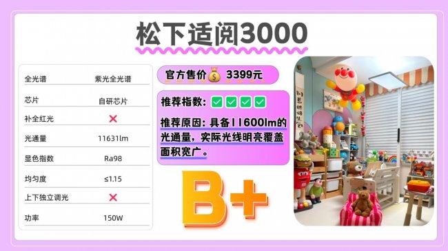 推荐款:松下适阅3000——具备11600lm的光通量,实际光线明亮覆盖面积宽广。