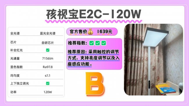 护眼大路灯第三名:孩视宝E2C-120W;采用触控的调节方式,支持亮度调节以及入座感应功能。