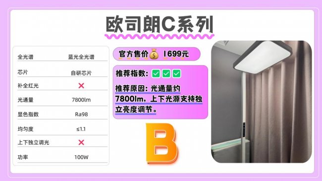 推荐款:欧司朗C系列——光通量约 7800lm,上下光源支持独立亮度调节。