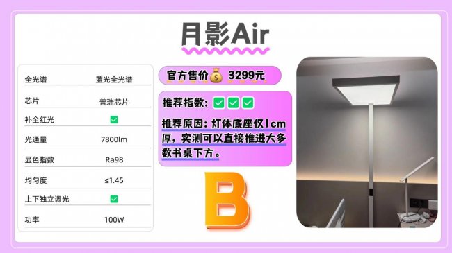 护眼大路灯第八名:月影Air;灯体底座仅1cm厚,实测可以直接推进大多数书桌下方。