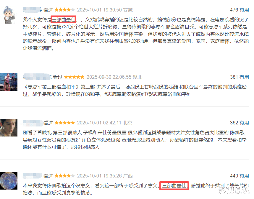 《志愿军》三部曲每一部续集的质量都要比前作更优秀,第二部上映时,观众们都表示第二部最好。而今第三部也已问世,观众们则又表示第三部才是“三部曲最佳”。