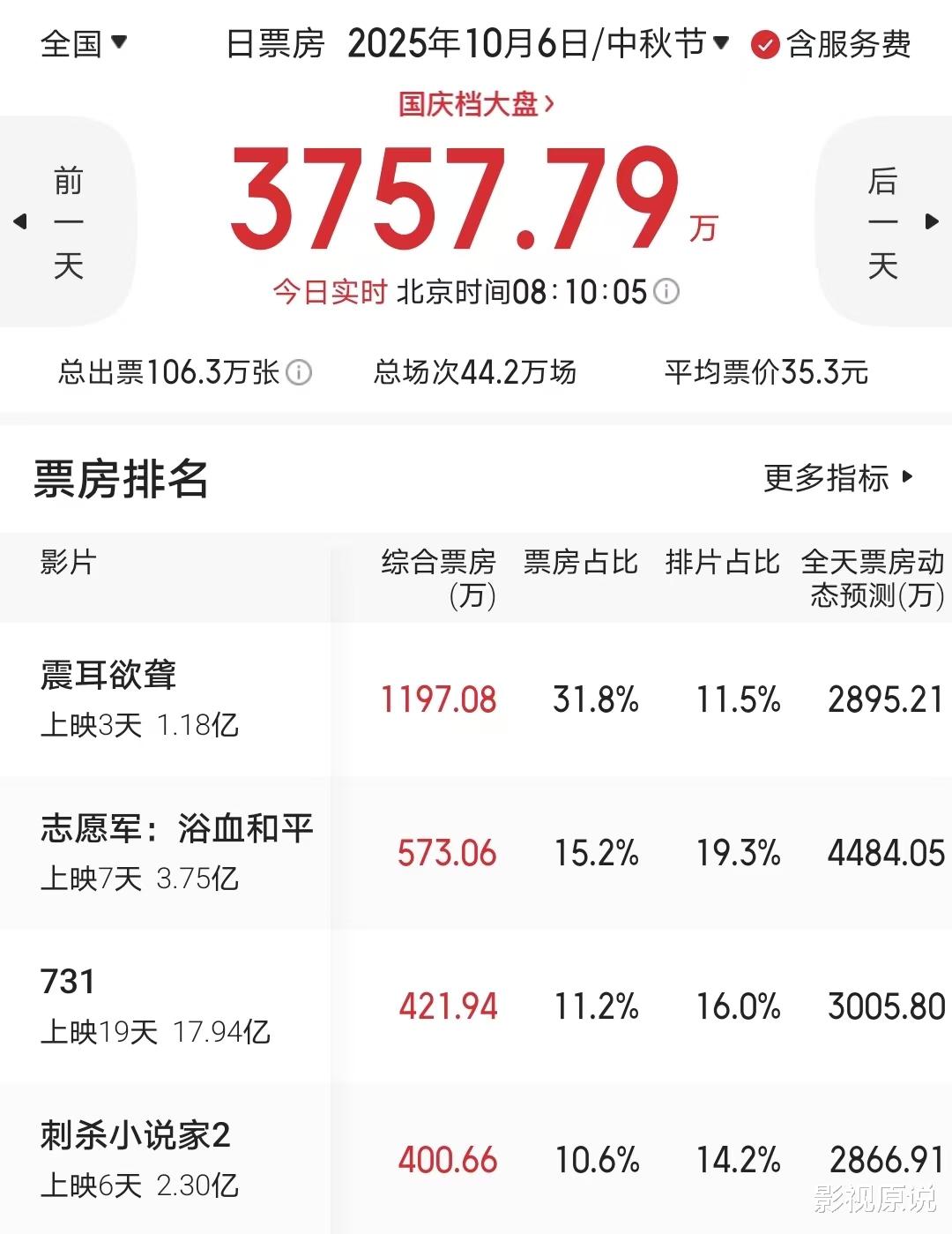 国庆档的第一天,《志愿军3》的单日票房突破了9000万人民币,以巨大的优势登顶日冠。