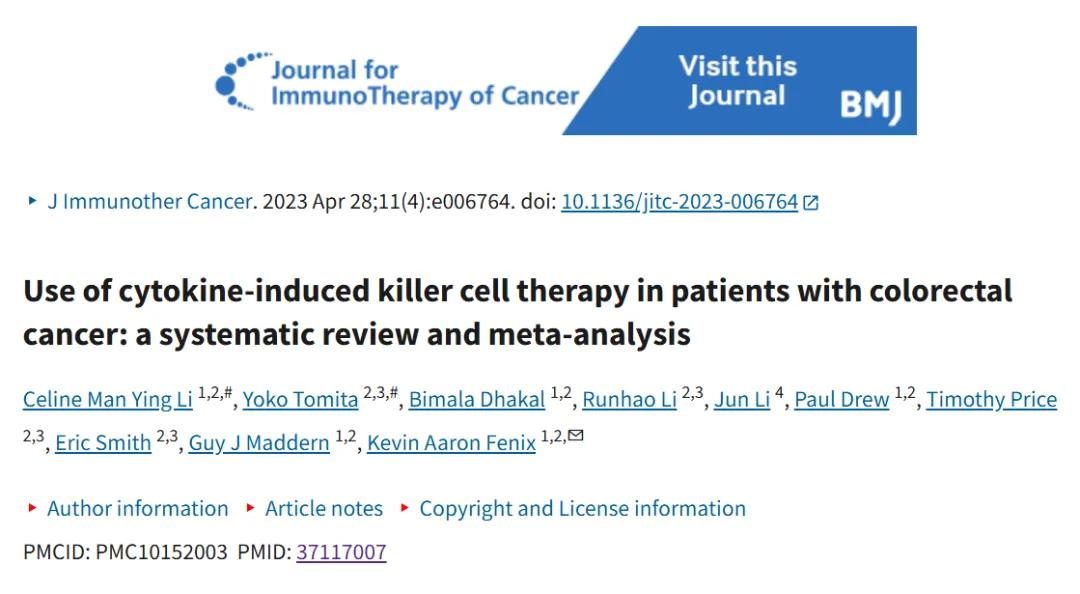 [9] Li CMY, Tomita Y, Dhakal B, Li R, Li J, Drew P, Price T, Smith E, Maddern GJ, Fenix KA. Use of cytokine-induced killer cell therapy in patients with colorectal cancer: a systematic review and meta-analysis. J Immunother Cancer. 2023 Apr;11(4):e006764.