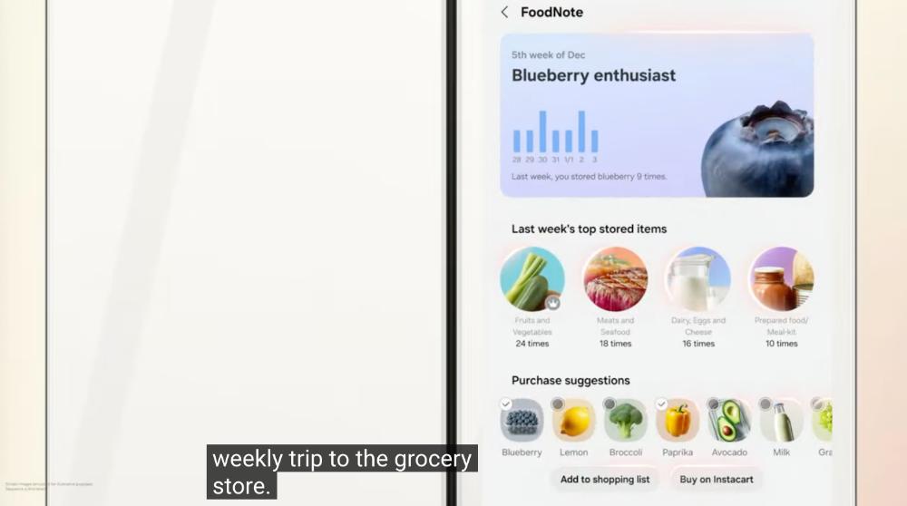 三星还推出FoodNote周度报告功能,能够定期汇总用户饮食习惯,包括常用食材、食谱推荐及需补货品项。