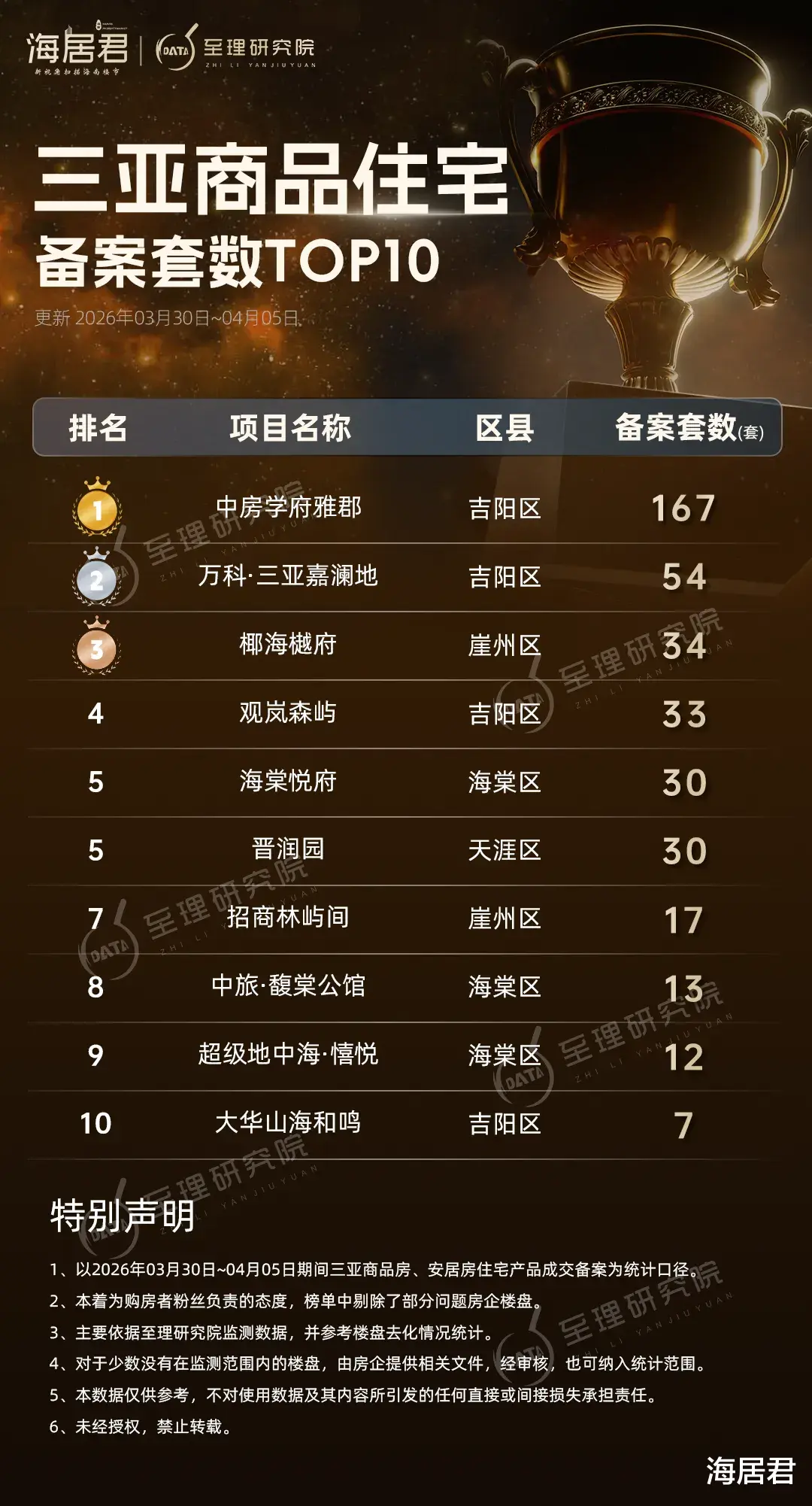 安居房中房学府雅郡成交167套、约19220平方米,继3月份拿下三亚楼市销冠后,4月份首周也拿下了三亚楼市成交套数、成交面积双冠。