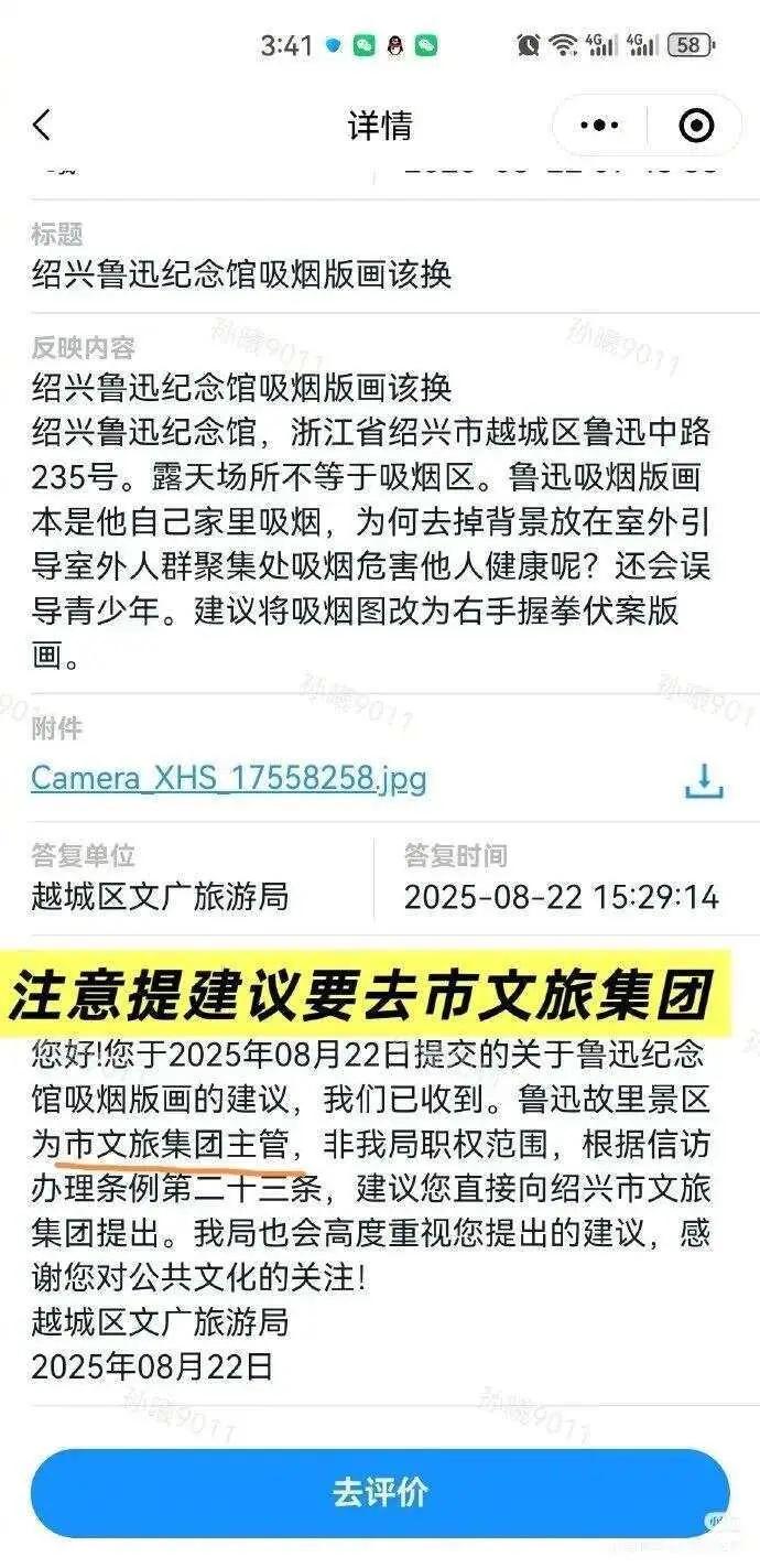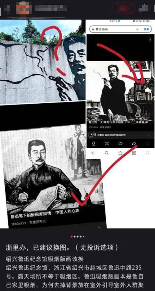 8月22日,游客孙女士通过政务平台“浙里办”发起投诉,指出该墙画存在误导公众、尤其是青少年之嫌。她认为,原画中鲁迅本是在家中书房抽烟,而纪念馆将其提取为独立形象置于公共场合,弱化了原境,可能传递“在公共场合吸烟无害”的错误信号。她建议馆方将画面更换为“鲁迅右手握拳”等更积极形象。