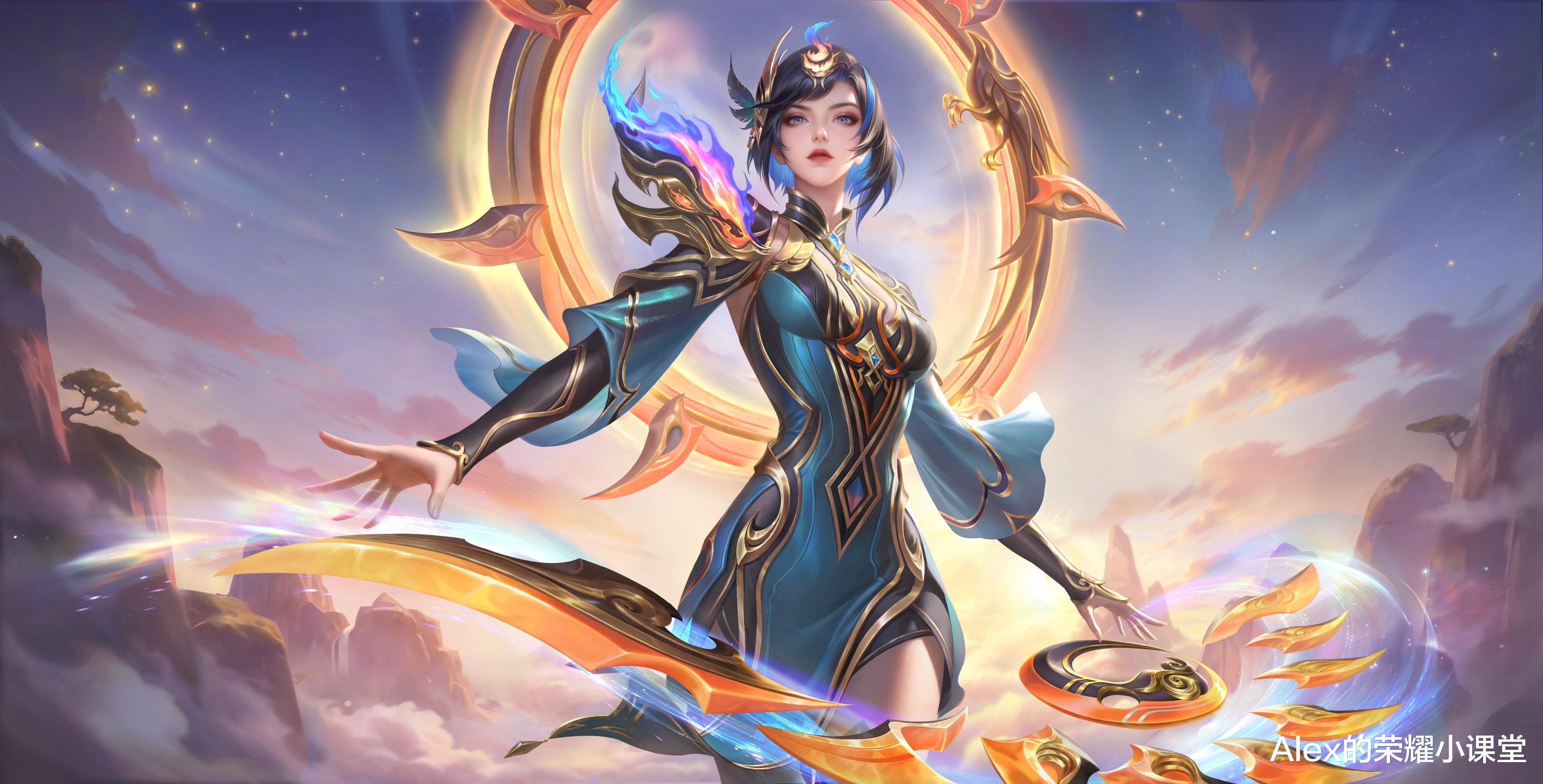 特效配色上以蓝青色为主,在原皮肤的基础上,融入了太阳图腾、太阳符文和湛蓝星辉流光元素。